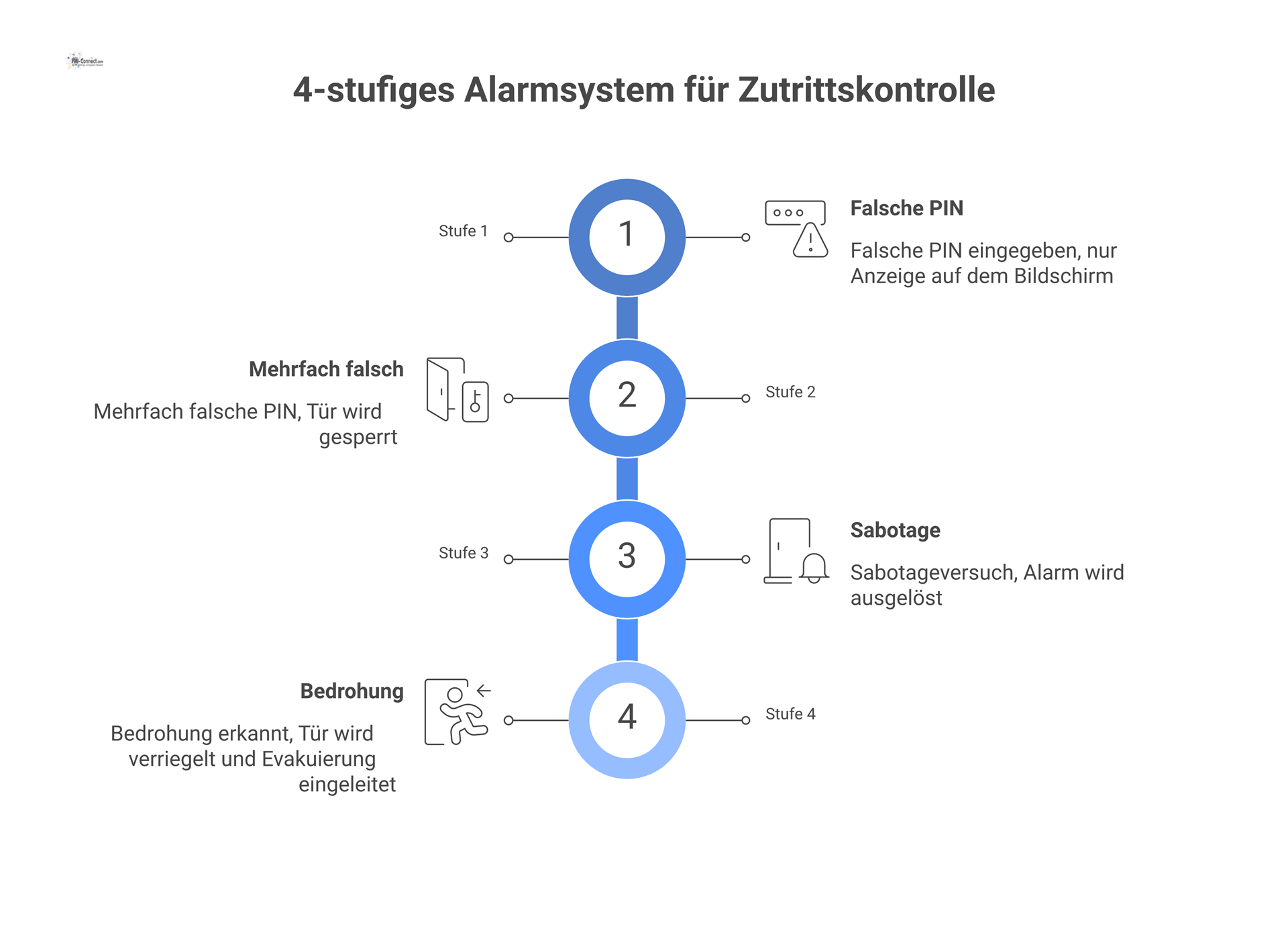 | Niedrige Priorität | Einzelne falsche PIN-/RFID-Karteneingabe | Lokale Anzeige „Zutritt verweigert“, kein Alarm |