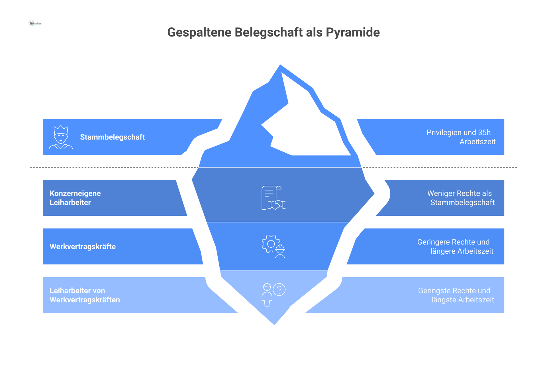 Motivation und Betriebsbindung: Ein zentrales Problem ist die Entstehung einer Mehr-Klassen-Belegschaft. Beschäftigte, die nominal unterschiedlichen Gruppen angehören, aber Seite an Seite arbeiten, vergleichen zwangsläufig ihre Arbeitsbedingungen. Wenn z. B. Stammmitarbeiter unter einem Haustarifvertrag oder Betriebsvereinbarungen (35-Stunden-Woche, Boni, betriebliche Altersversorgung) arbeiten, während Werkvertragskräfte länger arbeiten (40 Stunden), weniger verdienen und von betrieblichen Zusatzleistungen ausgeschlossen sind, führt dies zu Spannungen. Die IG Metall berichtete etwa in einem Beispielbetrieb von vier verschiedenen „Klassen“ von Beschäftigten: Stammbeschäftigte, konzerneigene Leiharbeiter, fest angestellte Werkvertragskräfte (bei einem Dienstleister) und zusätzlich nochmal Leiharbeiter der Werkvertragsfirma. Eine solche Fragmentierung untergräbt den Zusammenhalt. Interne Mitarbeiter könnten sich durch billigere externe Kollegen verdrängt oder in ihrer Wertschätzung gemindert fühlen; externe Kräfte fühlen sich oft als „Belegschaft zweiter Klasse“ – sie arbeiten zwar „am Arbeitsplatz sieht man den Unterschied kaum“, werden aber von vielen betrieblichen Aktivitäten ausgeschlossen (kein Zugang zu internen Informationen, keine Einladung zu Firmenfeiern, etc.). Dies kann die Motivation sowohl der Kernbelegschaft als auch der externen Mitarbeiter negativ beeinflussen. In der Praxis geben viele externe Fachkräfte an, lieber eine feste Stelle im Unternehmen zu haben, statt dauerhaft extern zu bleiben. Die Personalpolitik muss dem entgegenwirken, z. B. durch transparente Kommunikation, faire Behandlung aller im Team und ggf. Angleichung bestimmter Bedingungen (etwa die Equal Treatment-Ansätze, wonach längere Zeit im Betrieb tätige Leiharbeiter den Stammkräften gleichgestellt werden sollen).