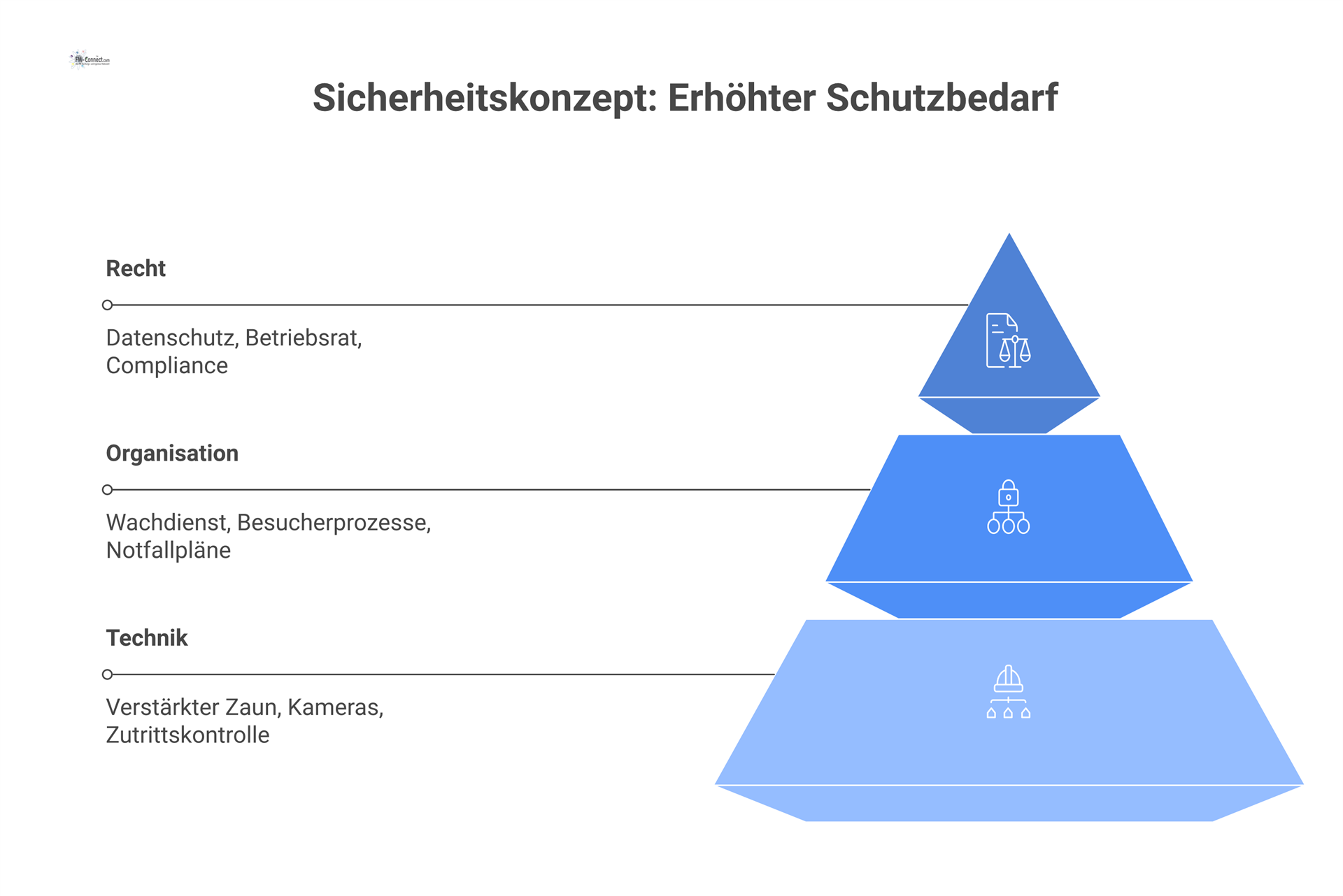 Bereiche mit erhöhtem Schutzbedarf weisen ein mittleres bis höheres Risikoprofil auf. Hier ist davon auszugehen, dass potentiell gezielte Angriffe erfolgen könnten – beispielsweise durch organisierte Diebe, die es auf hochwertige Güter abgesehen haben, oder durch Industriespionage, bei der Konkurrenten oder fremde Nachrichtendienste versuchen, sensible Informationen auszukundschaften. Auch Sabotageakte durch unzufriedene Ex-Mitarbeiter oder politisch motivierte Gruppen sind in diesem Szenario nicht ausgeschlossen. Die möglichen Schäden bei erfolgreichem Angriff wären deutlich gravierender als im Grundschutz: etwa erhebliche finanzielle Verluste durch Diebstahl wichtiger Anlagen, Verlust von Geschäftsgeheimnissen mit langfristigem Schaden oder erhebliche Betriebsunterbrechungen. Entsprechend muss das Sicherheitsniveau angehoben werden. Maßnahmen in dieser Kategorie zielen darauf ab, auch versierte und besser ausgestattete Täter zu entdecken und zu stoppen. Im Fokus steht eine lückenärmere Überwachung des Geländes und strengere Zutrittskontrolle, kombiniert mit ausgefeilteren organisatorischen Regeln. Im Folgenden die spezifischen Maßnahmen für erhöhten Schutzbedarf.