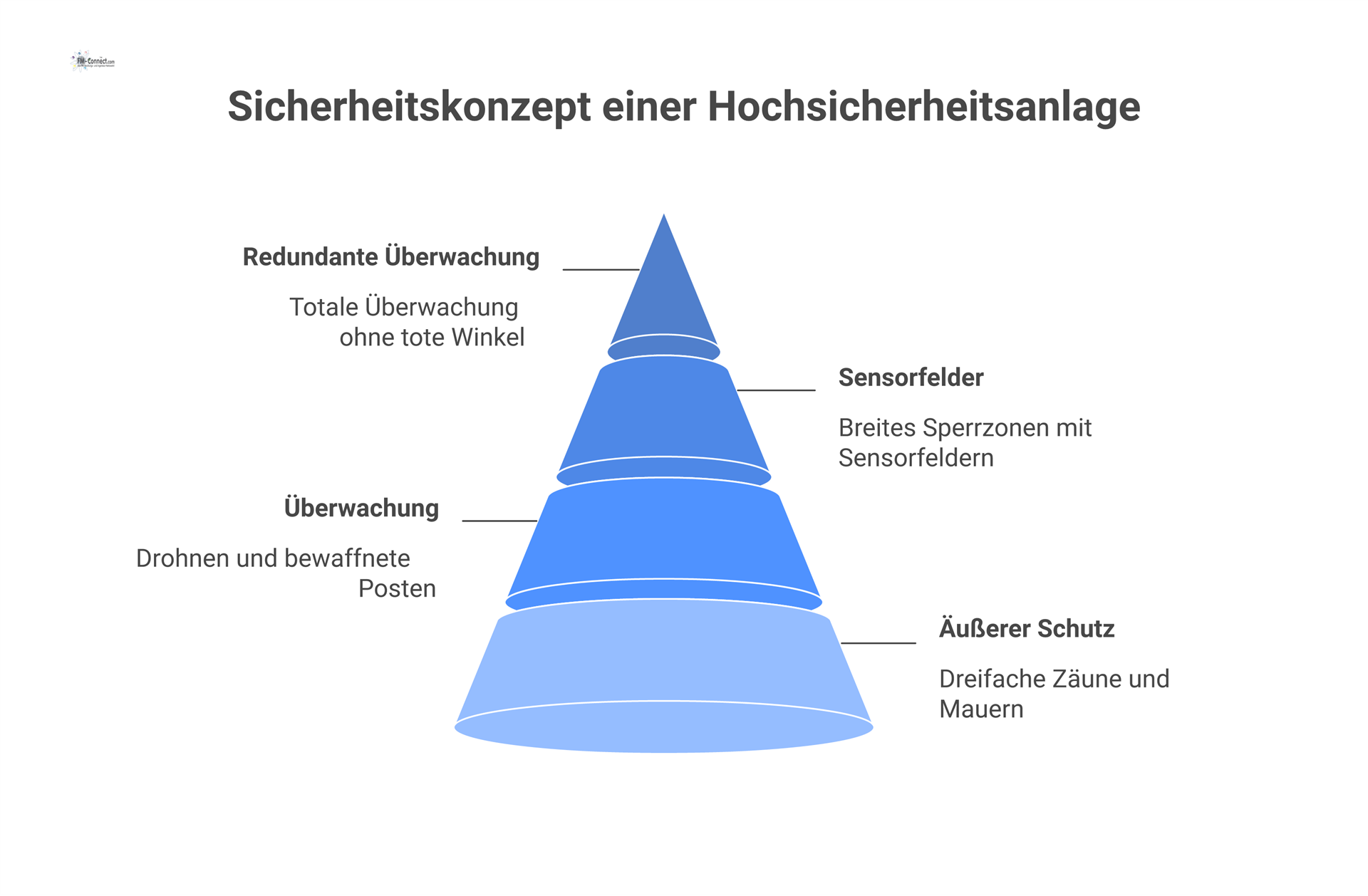 Spezialdetektoren: Je nach Szenario können exotische Sensoren hinzugefügt werden. Z. B. Schussdetektionssysteme (akustische Sensoren, die Schüsse erkennen) um unmittelbar auf Beschuss zu reagieren. Oder CBRN-Detektoren (chemische, biologische, radiologische Sensoren) am Perimeter, falls ein Angreifer versucht, gefährliche Substanzen freizusetzen. Insgesamt wird aus technischer Sicht jeder Zentimeter des Perimeters streng überwacht. Die Systeme haben höchste Zuverlässigkeit (selbst bei Stromausfall oder Sabotage laufen sie weiter, teils mit dieselbetriebenen Backups oder eigenem Versorgungsnetz). Redundanz ist so groß, dass ein einzelner Ausfall (ein Kameraturm oder ein Sensor) keinerlei blinden Fleck erzeugt, weil andere Sensoren überlappen. Alles ist ausgelegt auf frühestmögliche Vorwarnung: Ziel ist, einen Angriff bereits außerhalb des eigentlichen Schutzbereichs zu erkennen und reagieren zu können.
